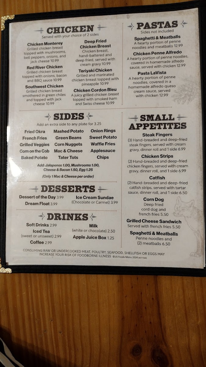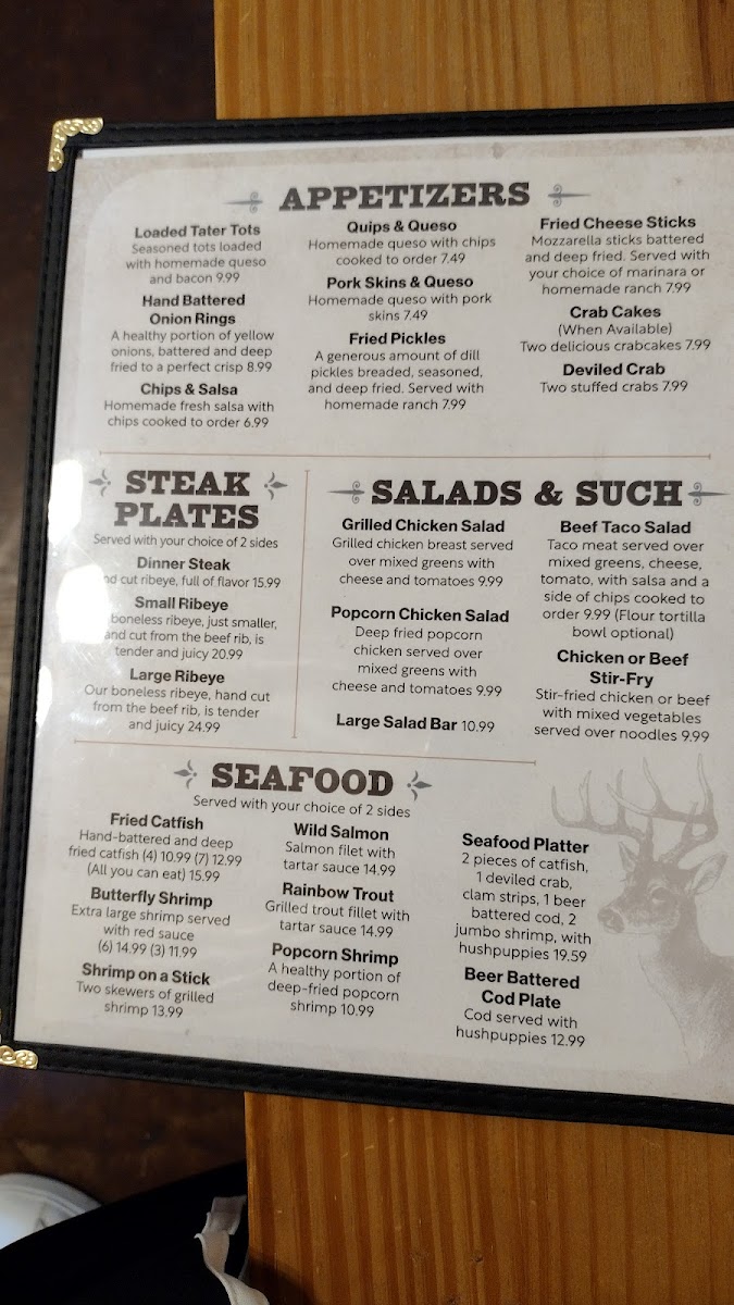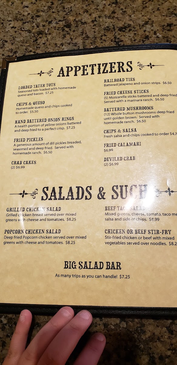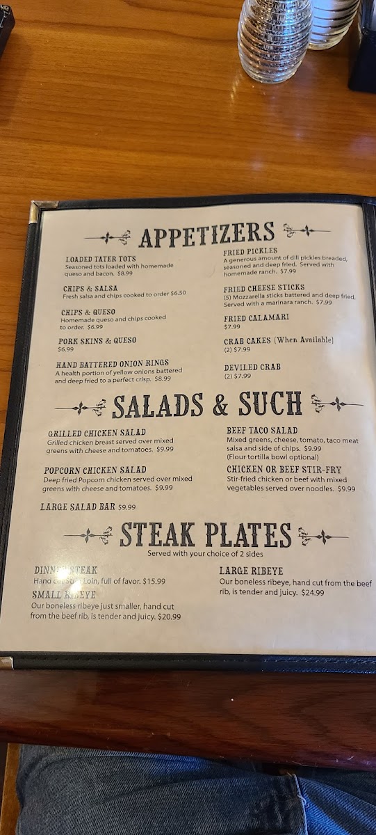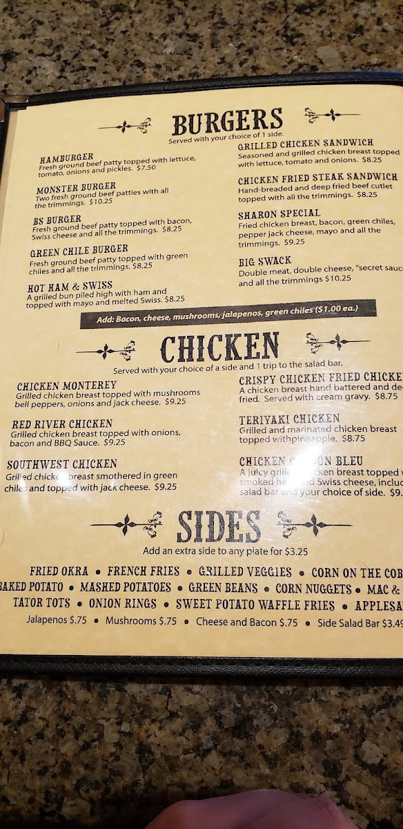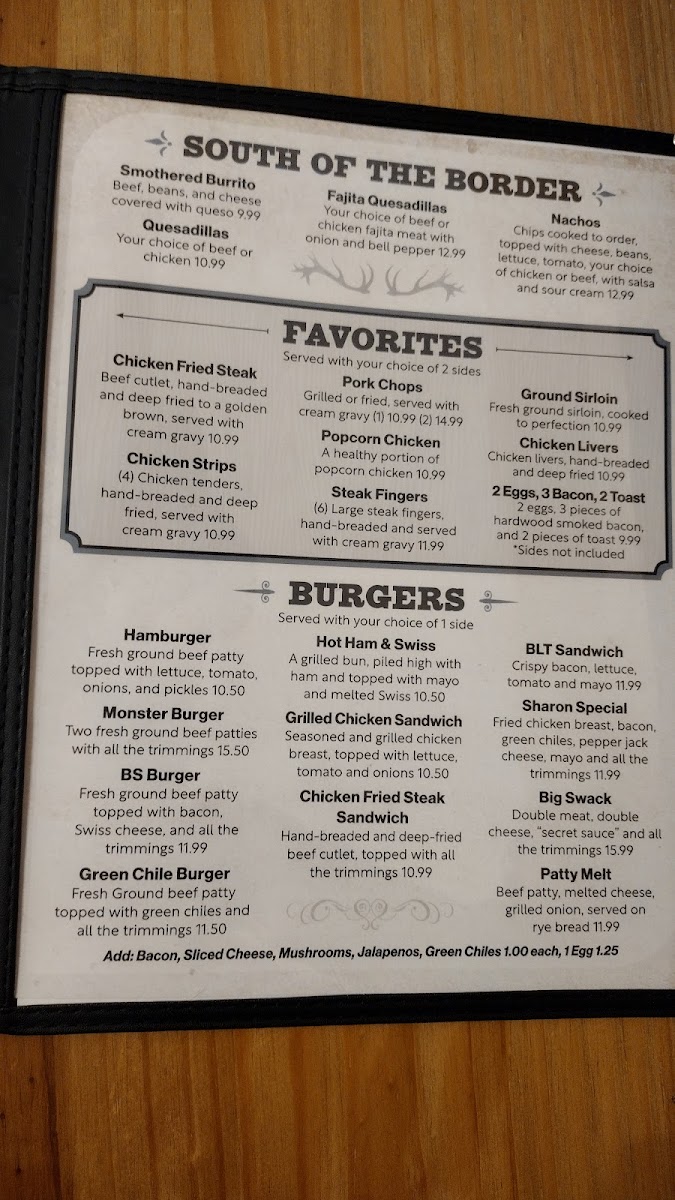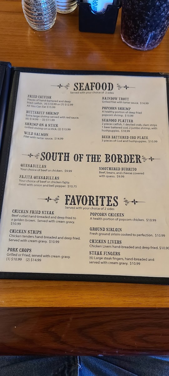 Highlights include savory steaks and shrimp, fresh salads, and comfort sides like mac and cheese or sweet potato waffle fries. For something with a little zest, the South of the Border options such as fajita quesadillas and smothered burritos provide flavorful variety without overwhelming the familiar feel of the dining experience.